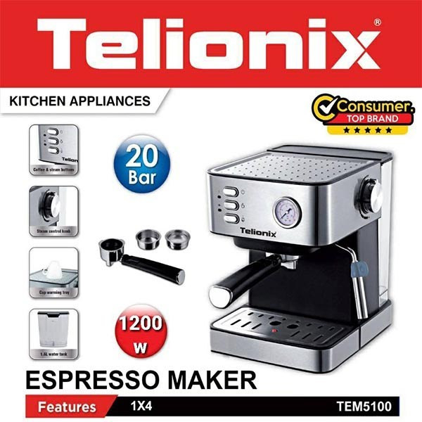 اسپرسوساز تلیونیکس (Telionix) مدل TEM5100 ، قهوه سازی حرفه ای با توان مصرفی 1200 وات و فشار بخار 20 بار می باشد. قهوه یکی از محبوب ترین نوشیدنی ها به حساب می آید. گاهی اوقات به دلیل مصرف زیاد زمان و یا بد شدن آن مردم از مصرف آن پشیمان می شوند.